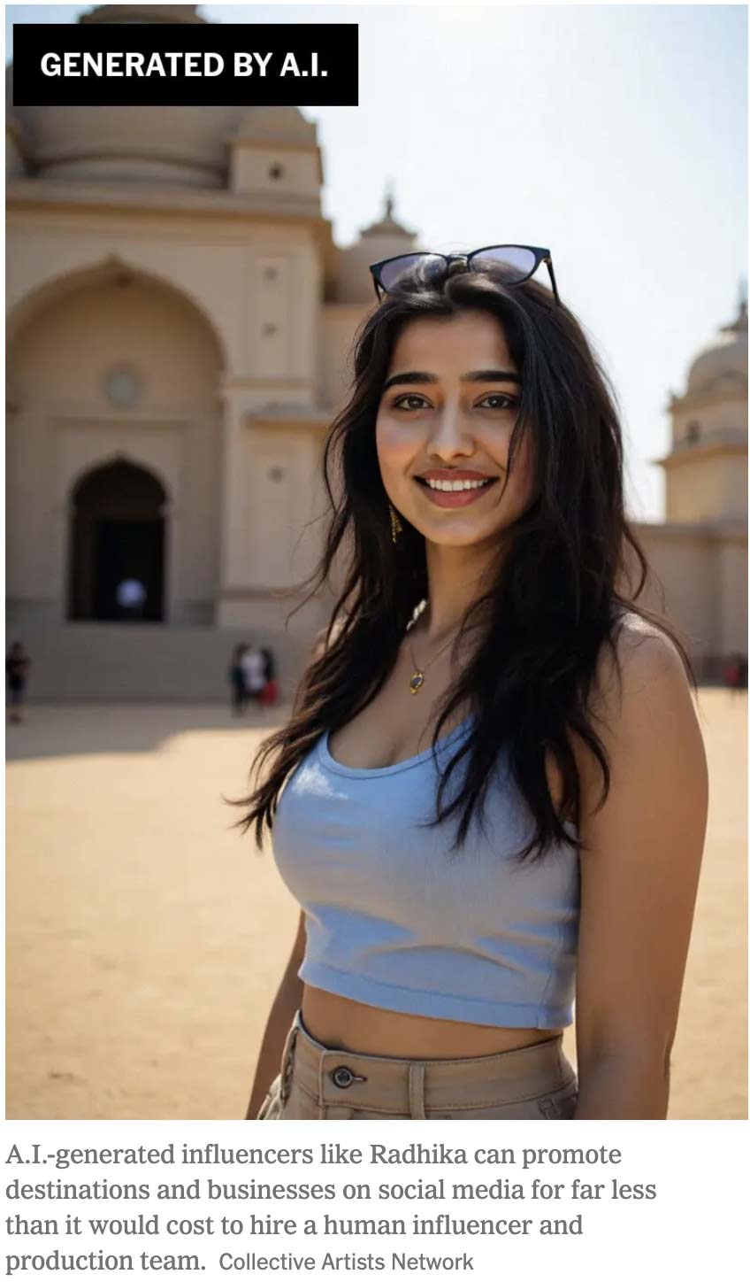 The NYT article, “These Travel Influencers Don’t Want Freebies. They’re A.I.,” explores how AI-powered virtual personalities are reshaping the influencer economy, challenging long-standing assumptions about authenticity, credibility, and human connection in online spaces.